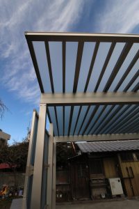屋根材の「熱線遮断ポリカーボネート板」は、アクリル板に比べて約20倍衝撃に強く弾力に富んだ材質で、有害な紫外線をほぼカットします。