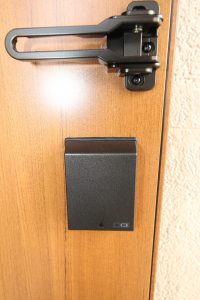 また通常のドアガードの使用方法に加え、アーム部分を受け側にスライドすることでドアをロックでき上下の鍵と合わせて使用するとより安心です。