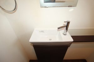 手洗器はシャープなエッジですっきり角デザインの【ベッセルタイプ】、水栓は【ハンドル水栓タイプ】を採用しました。