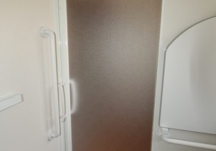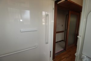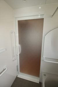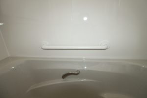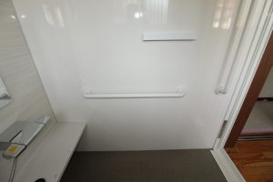 浴室への出入りもつまづきにくく移動しやすいよう出入り口の段差を極力減らし、また表面に凹凸加工を施すことで濡れていても滑りにくく転倒しにくい床なので安心で、【安心ハンドバー】を取付けることで浴槽内や浴室の立ち座りのサポートや身体を支えられより安全に!