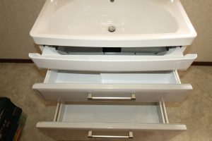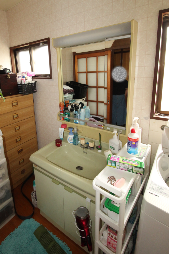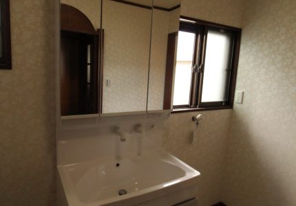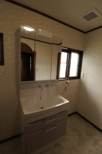 洗面化粧台はたくさん収納があって使い勝手のいい物へ、脱衣場も一緒にキレイにしたいとご依頼いただきました。