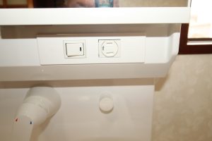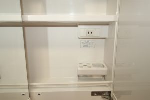 キャビネットは「2段スライドタイプ」を採用し収納物が見やすく出し入れしやすく、ミラー裏やミラー横にもたっぷり収納棚で、ミラー裏には便利な小物ラックとコンセントがついているのでスッキリ収納できます!