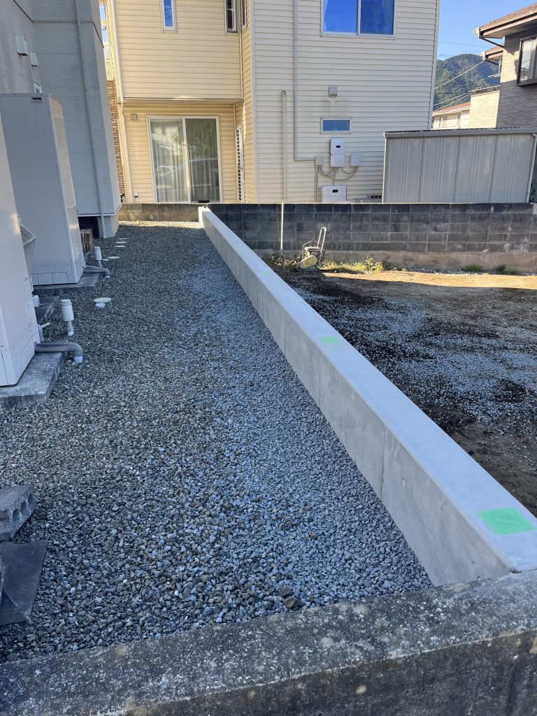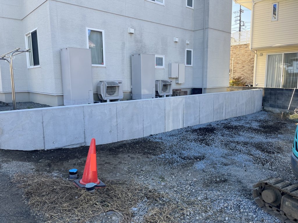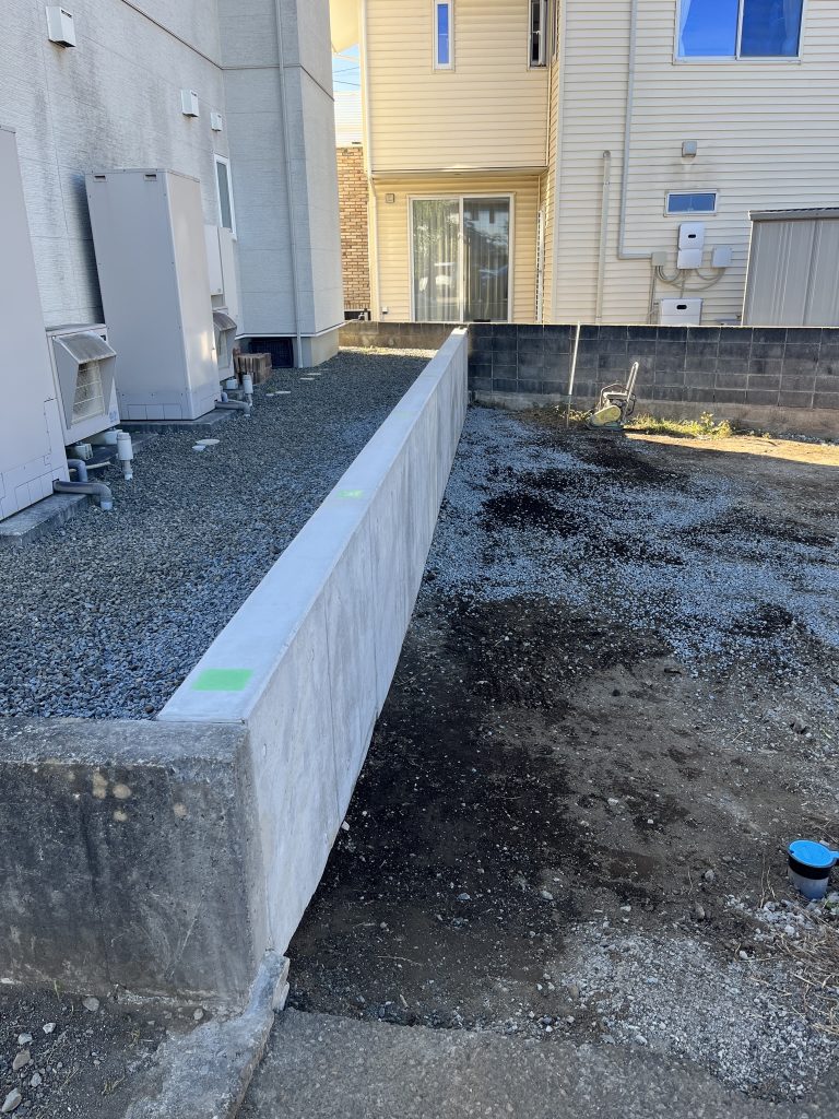 コンクリートを打設し硬化後、型枠を外して掘った穴を元に戻せば、しっかりとした擁壁が完成します。