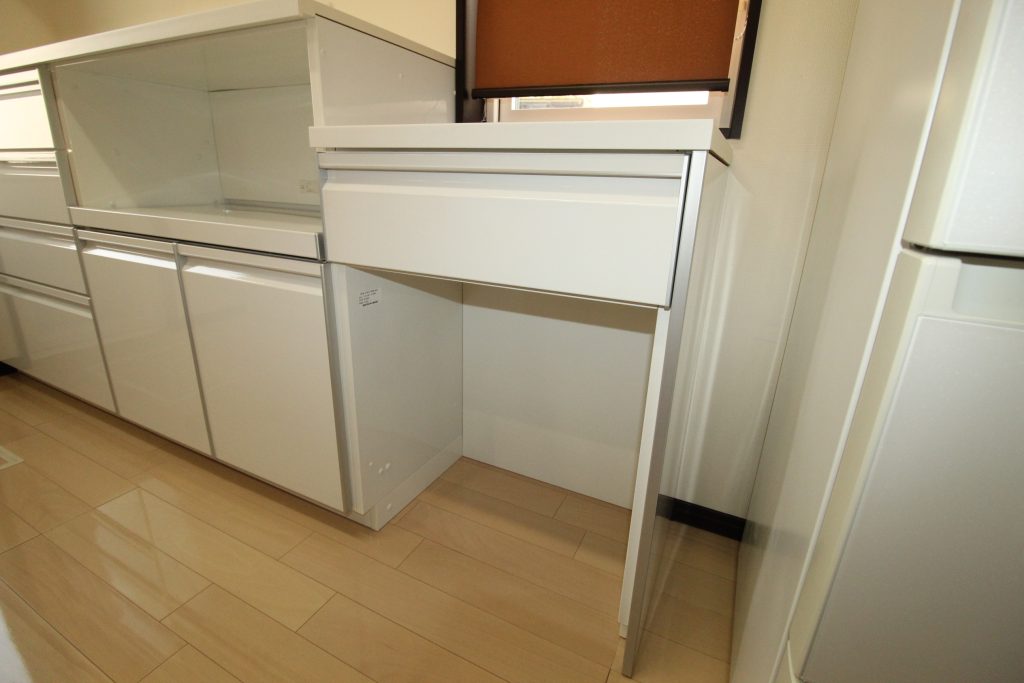 ハイカウンタータイプは「4段引出しキャビネット」を採用し、食器などもキレイに整頓して収納することができます。家電収納ユニットは調理家電を収納でき、中央部分を引き出して使用することが出来るので大変便利で、「扉タイプ」を採用したので食品のストックや調理器具などを収納できるので、キッチンまわりもスッキリ!