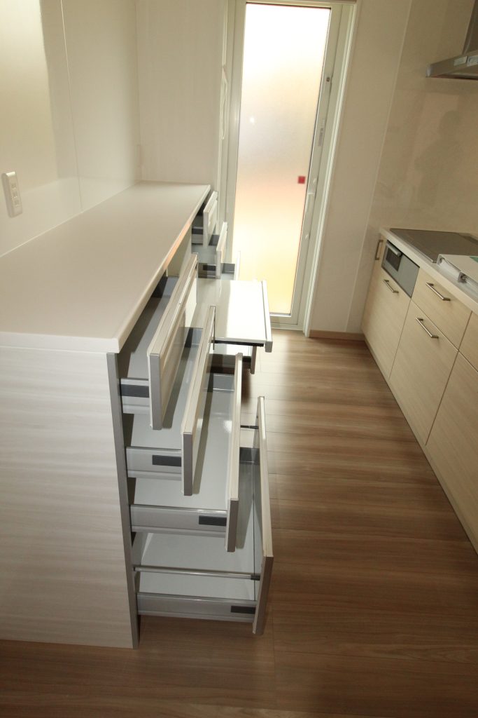 ハイカウンタータイプの「4段引出しキャビネット」を採用し、食器や食品のストックなどキレイに整頓して収納することができます。