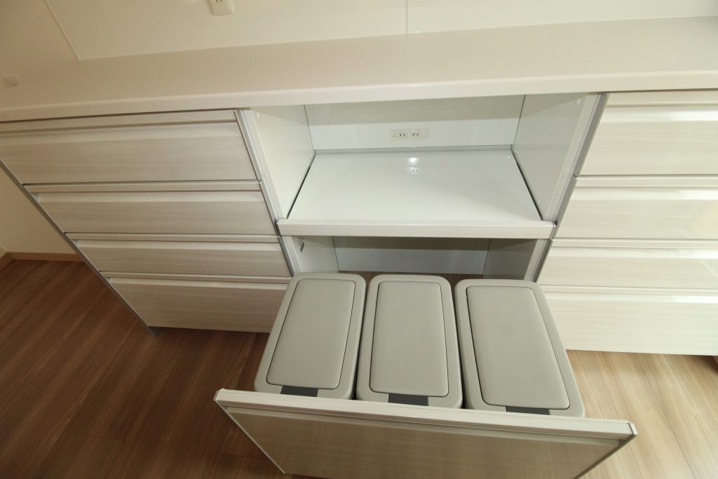 家電収納ユニットは「収納ワゴン付タイプ」採用し、調理家電を収納でき中央部分を引き出して使用することが出来るので大変便利で、置き場所に困るゴミ箱を収納できるのでキッチンまわりもスッキリ!