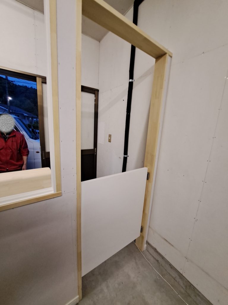 木材で間仕切りとなる枠を作り、耐熱性・断熱性があり、水濡れ湿度に比較的強く腐食しにくい「ケイカル板」を貼り耐衝撃性が高い間仕切りを設置しました。