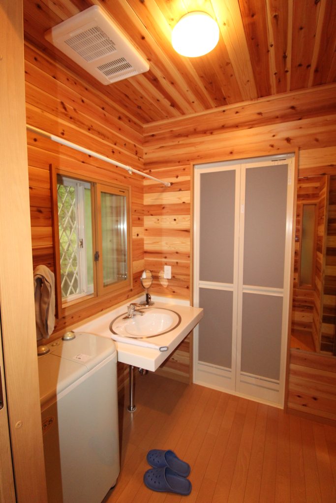 洗面脱衣場も木目の壁・天井・床で、リラックスできる空間になりました。
