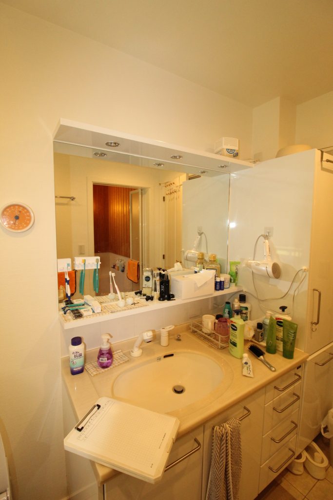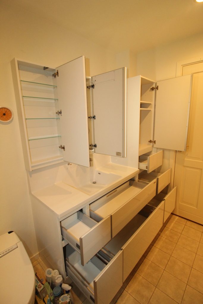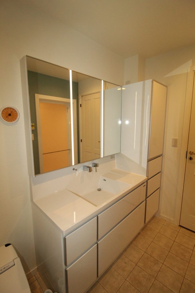 洗面化粧台を新しく、たくさん収納できるものへ変えたいとご依頼いただきました。