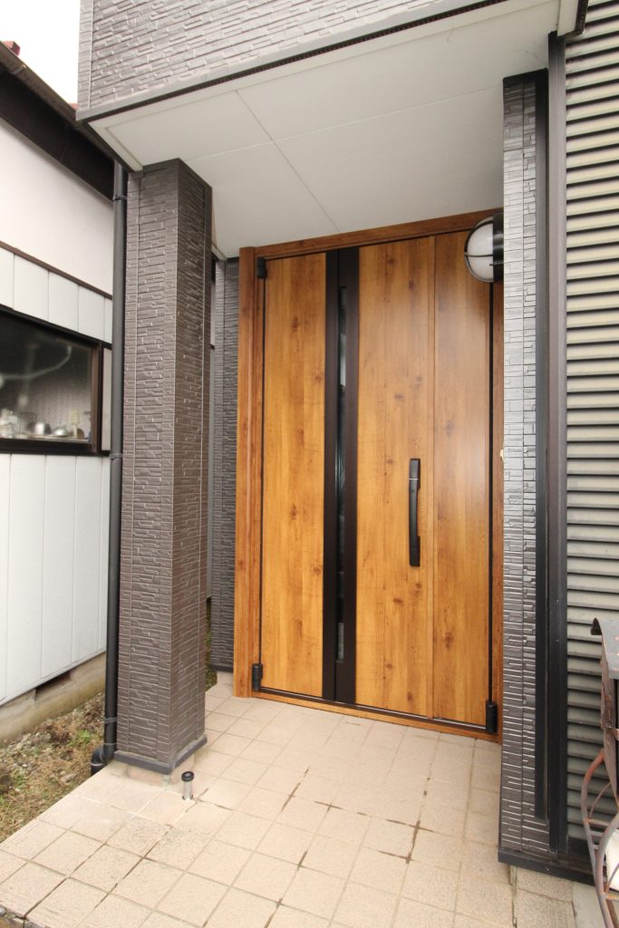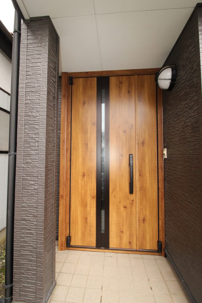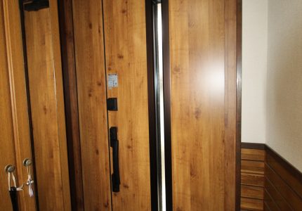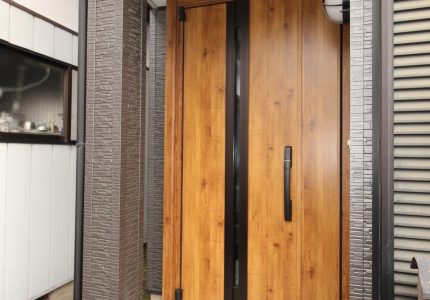 木目を活かしたナチュラルカラーの「マキアートパイン」が、柔らかな印象で落ち着いた雰囲気の玄関ドアへ。