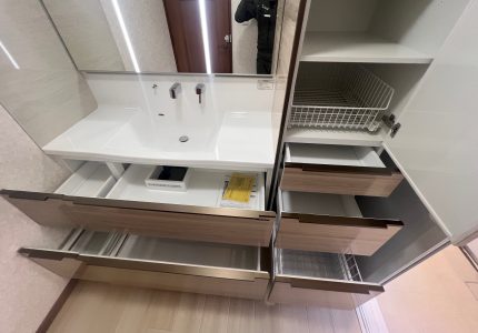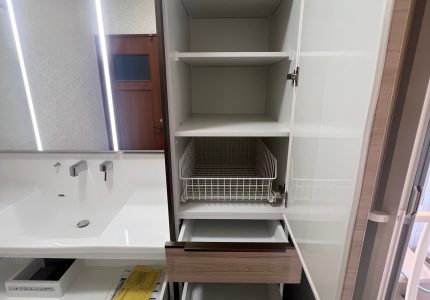 洗面化粧台のサイドには「トールキャビネット」を設置し、さらに収納力を高めました。