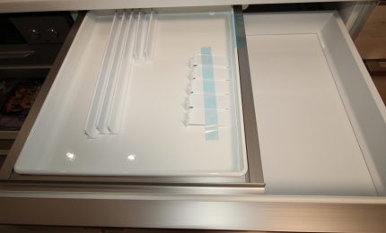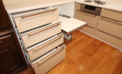 収納面でも、引き出しの中にさらに収納を加える多段引き出しや、スプーン・フォークなどを整理できるマグネット付きのインナーケース、小物をすぐに取り出せるフロントポケットなど、使いやすさにこだわった工夫が満載!