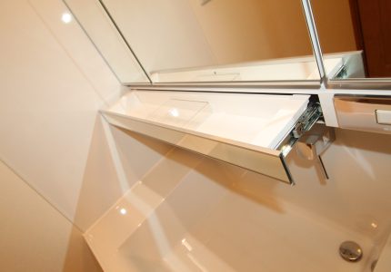 ミラーはスタイリッシュ3面鏡を採用し、ミラー裏収納スペースは可動棚でたっぷり収納でき、電源コンセントも備えているため、電動歯ブラシやドライヤーなどをスッキリと収納できます。