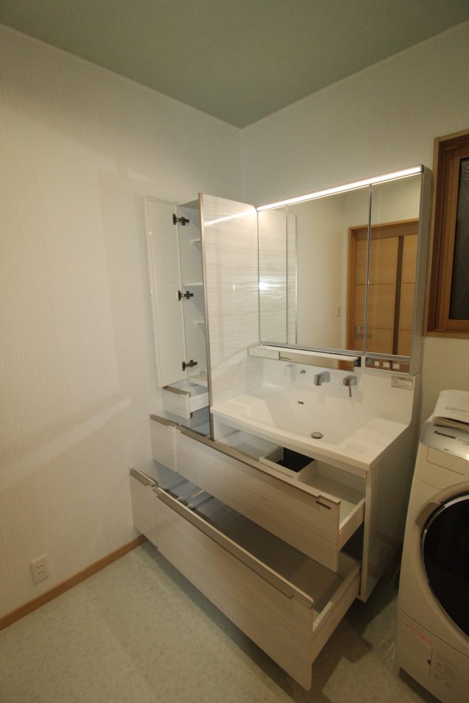 #脱衣場 #脱衣室 #洗面所 #洗面室 #タカラスタンダード #エリーナ #ハイバックカウンター#フロートタイプ #3面鏡 #収納 #壁 #天井 #クロス #床 #クッションフロア #張替え #キレイ #清潔感