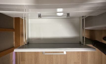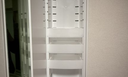 キャビネットは奥行き50cmのコンパクト設計でスッキリ収まり、収納品が見やすく出し入れしやすい2段スライドタイプを採用しています。