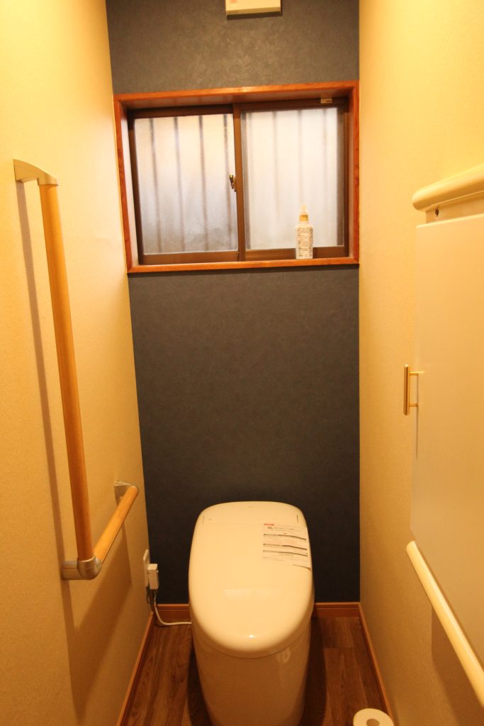 ベースとなる壁と天井のやわらかいトーンが、トイレ全体に明るさと安心感を与え、