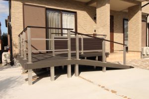 前回、掃き出し窓から取付けさせていただいたウッドデッキにスロープ用のYKK AP『リウッドデッキ200』とウッドデッキとの段差がなくなるよう『ハイステップコーナー』を設置し、車イスがスムーズに上り下り出来るようにしました。