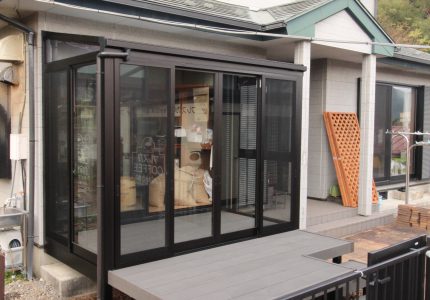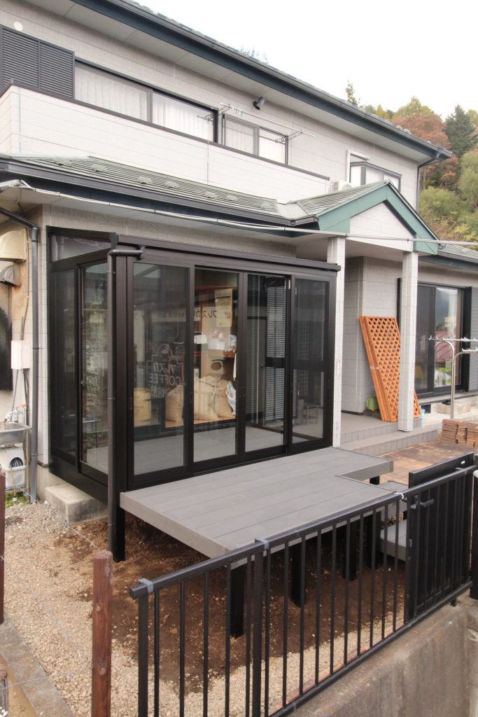 掃き出し窓から直接商品の受け渡しが出来たり、荷物を置くスペースとしても使用できるYKK AP『ソラリア テラス囲い』といずれはコーヒー豆の焙煎を待っている間にコーヒーが飲めるミニカフェスペースができたらいいのではないかとYKKAP『リウッドデッキ200』をご提案させていただきました。