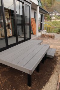 ウッドデッキ本体との段差解消に、頑丈で安定感のある『リウッドステップ』を二段取付け、上り下りラクラクに!