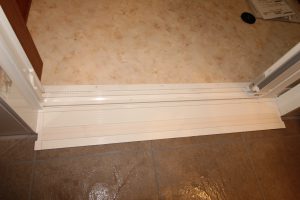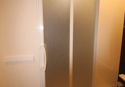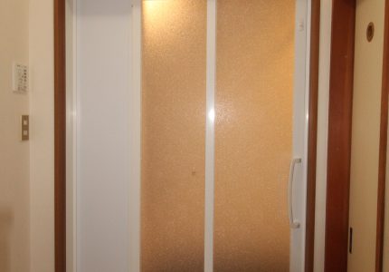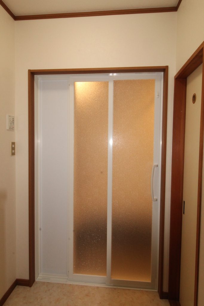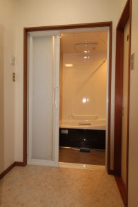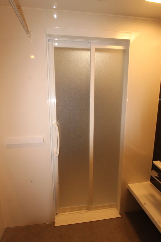 浴室ドアは2枚引戸に変えました。開閉動作がラクで戸袋スペースがなくても設置できます。