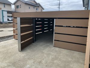 床下囲いの商品で扉がついた物はありませんが、弊社の斎藤がお客様のご希望に添えるようにとウッドデッキをアレンジし扉を作製させていただきました。