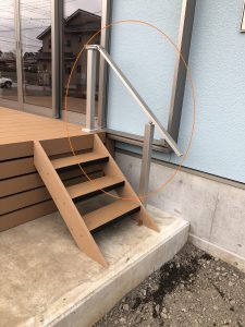 以前、施工させていただいたリウッドデッキ(床下囲い)のリウッドステップ横に『ステップ補助フェンス』を取付けさせていただきました。