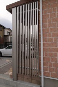 スクリーンはたて格子でシャープな印象を深めながら、玄関先のプライバシーをしっかり守り採光・通風にも優れます。