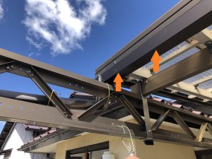 そこで屋根から流れてくる雨水を受けれるように75角のアルミ柱を加工し、取付けさせていただきました。