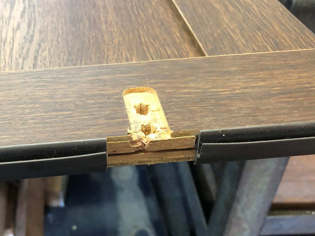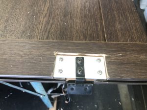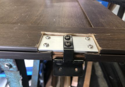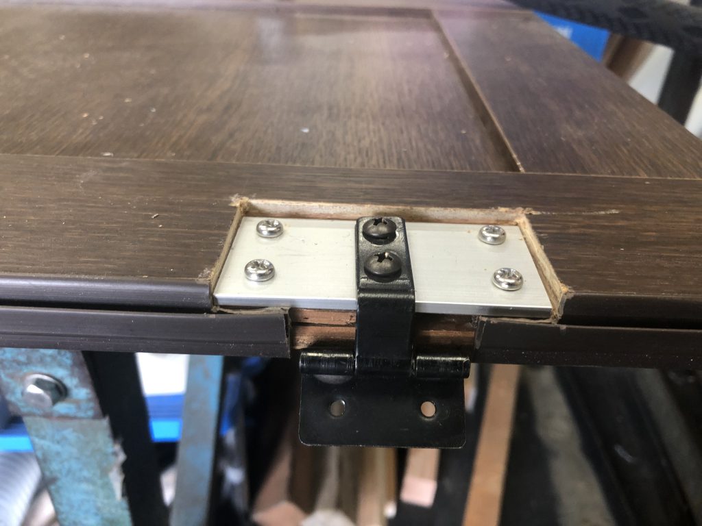 ドアを固定するT字型丁番を止めておくネジ周りの木材が、劣化により脆くなっていて部品と一緒にもげてしまい同じようには戻せないので、しっかり支持できるよう部品の廻りを削り「アルミフラットバー」を入れ丁番を固定できるようにしました。