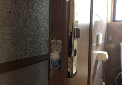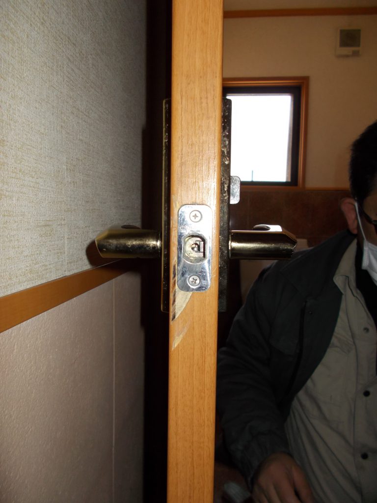トイレのドアと鍵が勝手に閉まり開けられなくなってしまい、切って開けたので鍵がかけられない状態になってしまった。