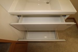 「キャビネット」のすみずみまで水回りに最適な素材“高品位ホーロー”だから、湿気に強く快適で長持ち!木製キャビネットにありがちな傷みや染みの心配がありません。