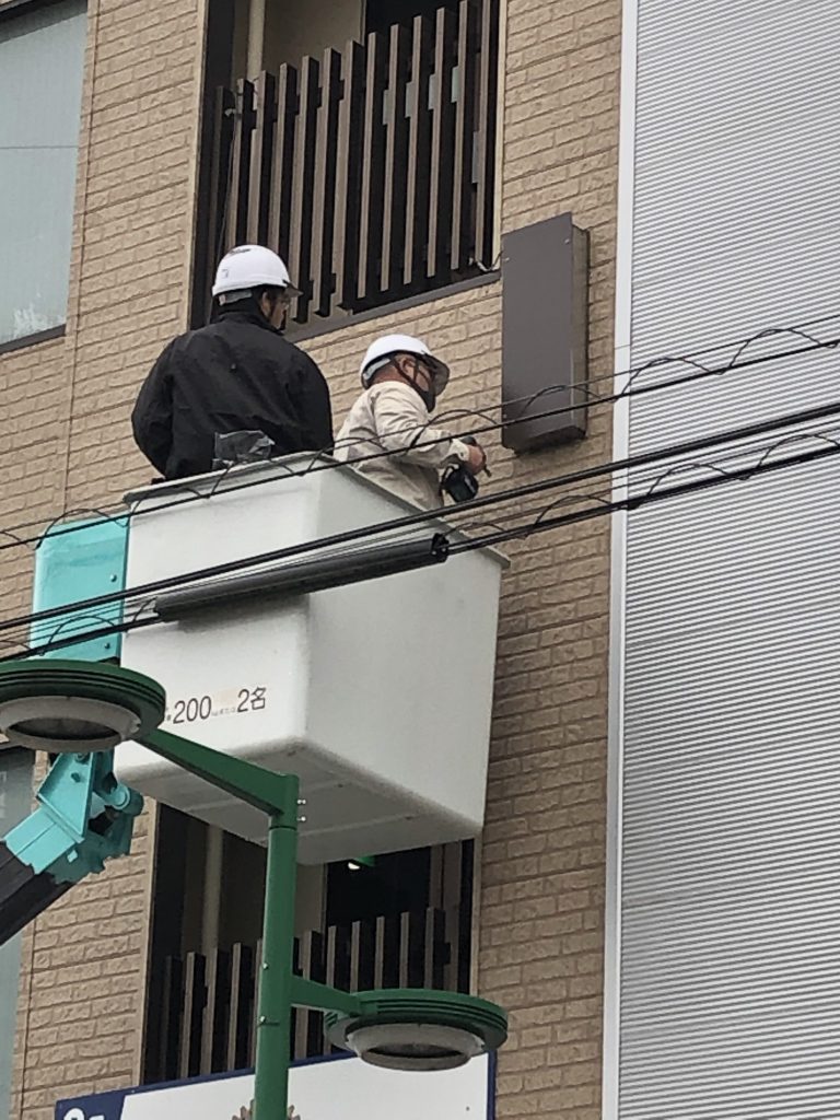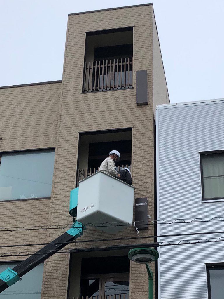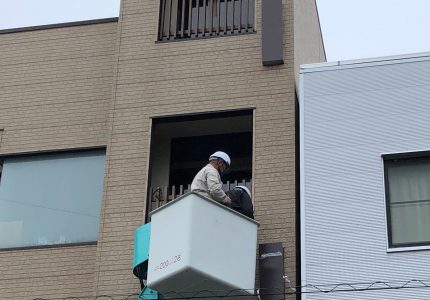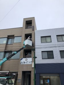 今回はビル3階部分の袖看板でしたので、高所作業車で撤去を行いました。