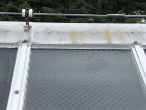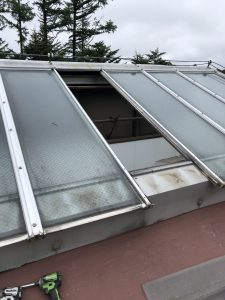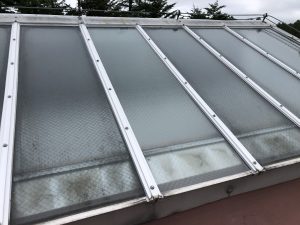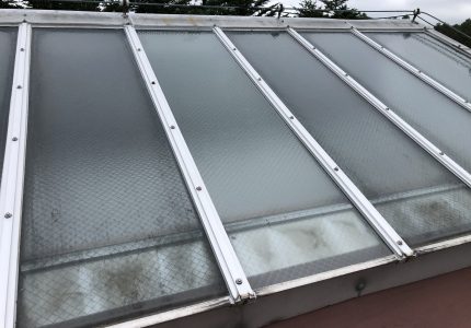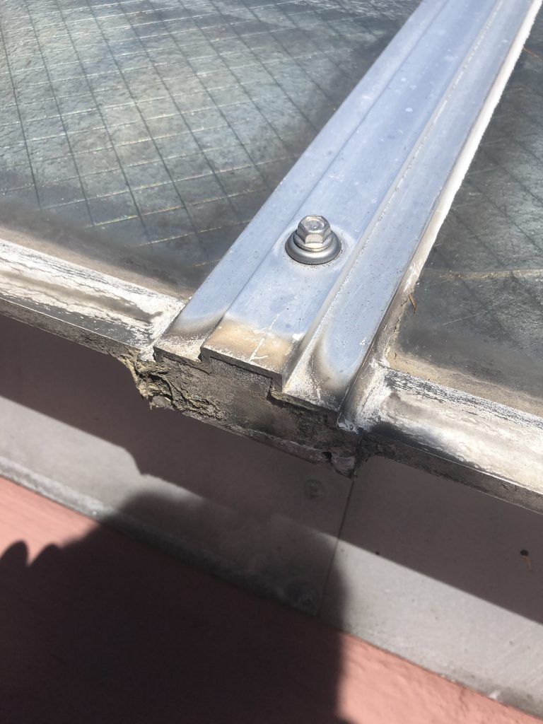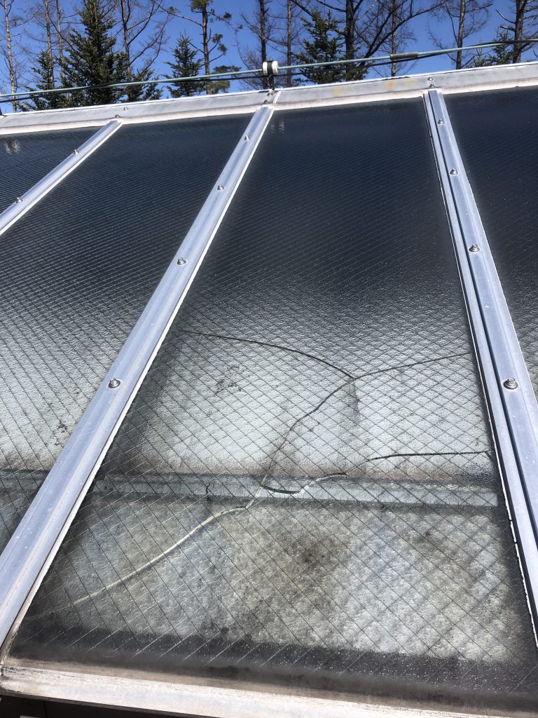 トップライトガラス(天窓)ということもあり、天井から割れてしまったガラスが落ちてくる可能性があるのでとても危険な状態です。