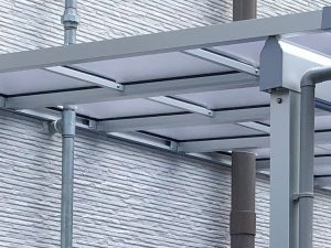 屋根材は【ポリカーボネート板】で、軽量でプラスチックの中では耐衝撃強度が高く、ガラスと同程度の透明性を持ち、紫外線カットにも優れています。
